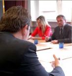 Beispiel: Arbeitstreffen von zwei Geschäftspartnern mit der Anwesenheit eines Dolmetschers oder Dolmetschen bei Gericht.